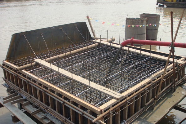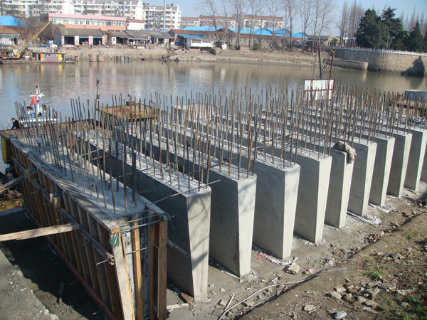 南通船闸下游引航道护岸加固施工项目A合同段位于船闸下游引航道右侧辅导航墙向下游方向500m段,凿除老驳岸▽2.3 m(废黄河高程系,下同)以上墙体,新筑C25砼踏步的形式与原地面衔接,墙后采用深层搅拌桩加固,墙前底高程▽-0.8m以下采用抛填袋装碎石防护,平台宽度2m,并以1:1.5的边坡护至河底设计高程。前沿距离原护岸临水面7m新建靠船墩,靠船墩采用钻孔灌注桩基础,墩身为独立靠船墩空箱结构,靠船墩间距20m,共25个,靠船墩采用预制板结构与岸衔接。(与船闸纵轴线呈垂直布置)。